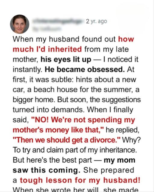When My Husband Found Out How Much Iโd Inherited From My Late Mother, His Eyes Lit Up