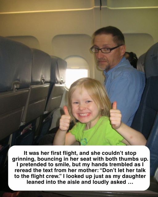IT WAS HER FIRST FLIGHT, AND SHE COULDN’T STOP GRINNING, BOUNCING IN HER SEAT WITH BOTH THUMBS UP