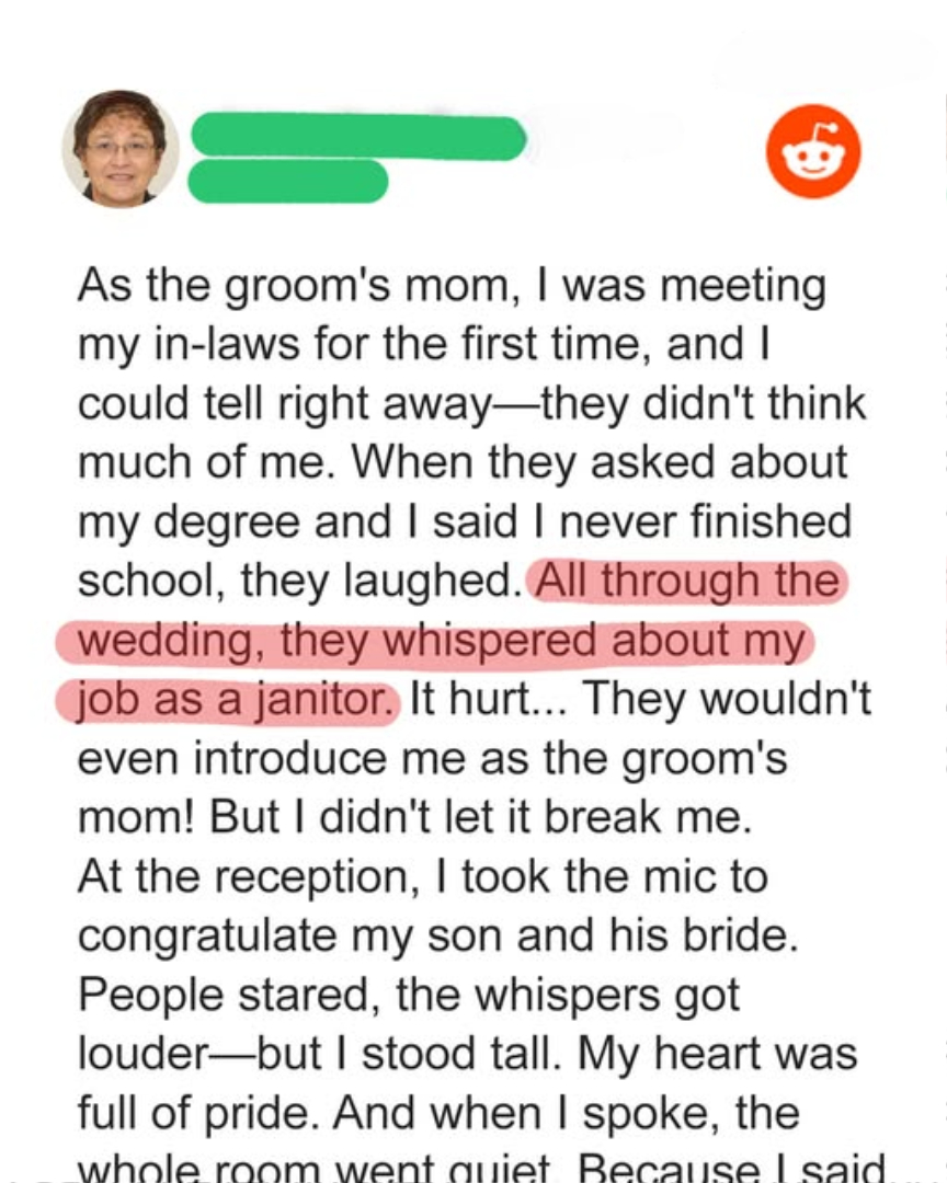 In-Laws Laugh At Groomโs Janitor Mom Until She Takes Stage To Congratulate Newlyweds