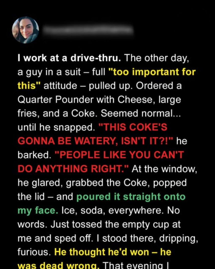 Rude Customer Humiliated Me And Threw Coke In My Face At The Drive-Thru โ I Made Him Regret It The Same Day