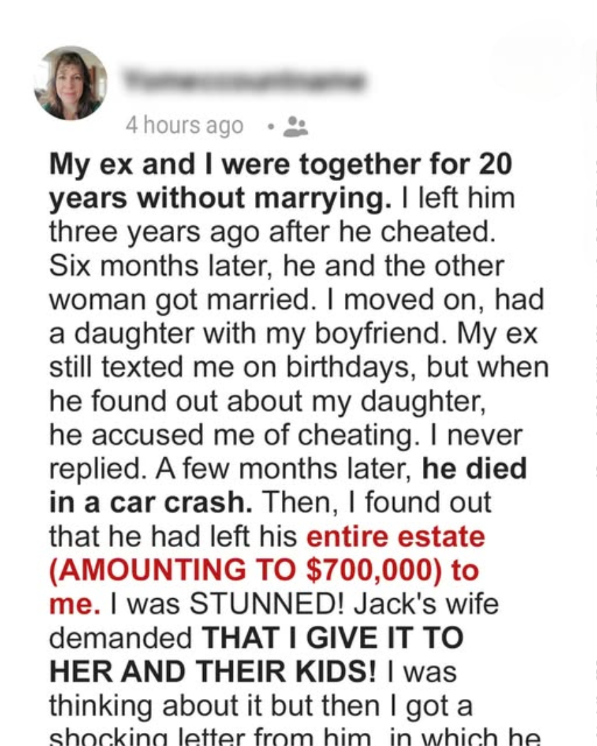 My Ex Left His Estate To Me Instead Of His Wife & Kids After His Death