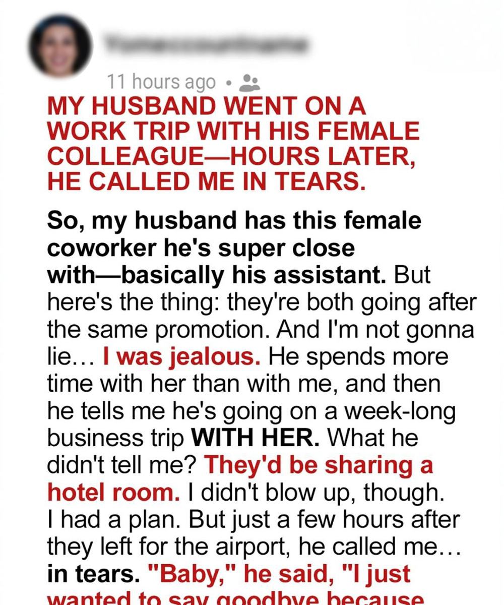 MY HUSBAND WENT ON A WORK TRIP WITH HIS FEMALE COLLEAGUEโHOURS LATER, HE CALLED ME IN TEARS.